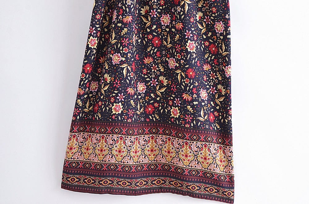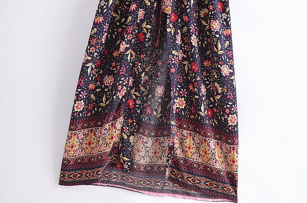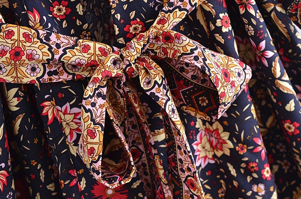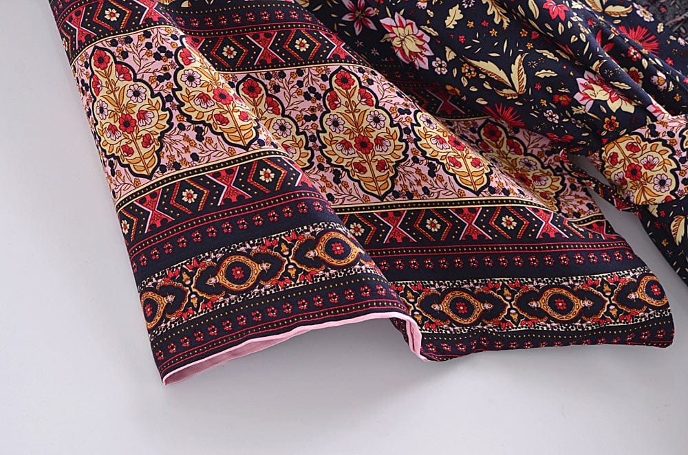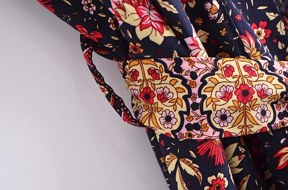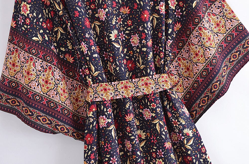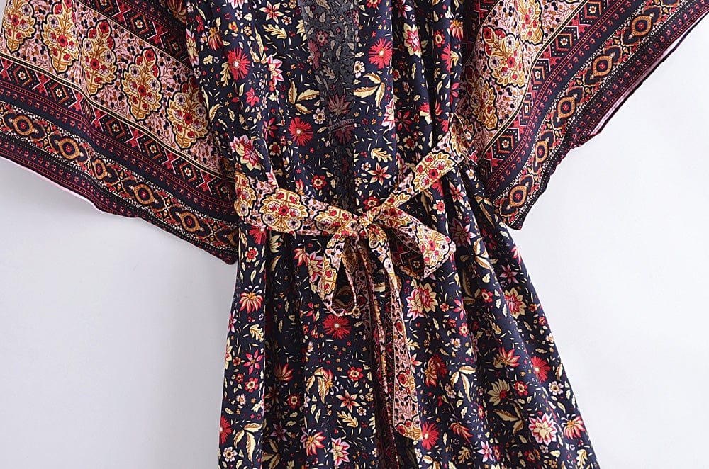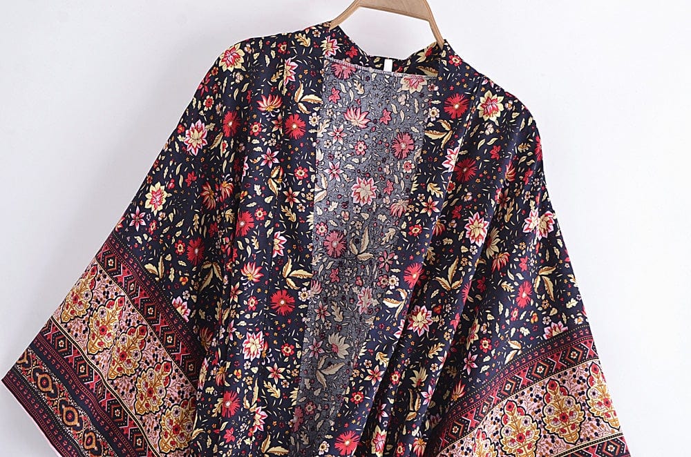 About:?This kimono has a floral, longline silhouette and a blended bohemian-inspired? print with a front tie clasp, making it a gorgeous boudoir staple.