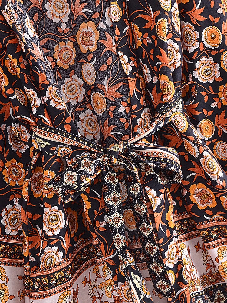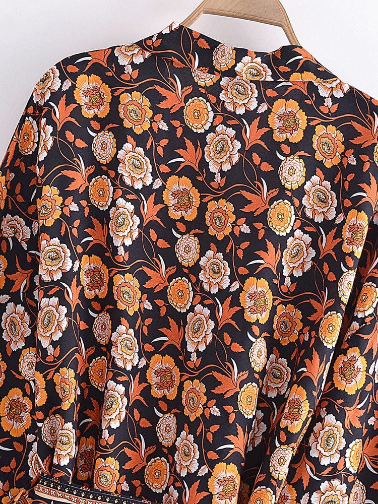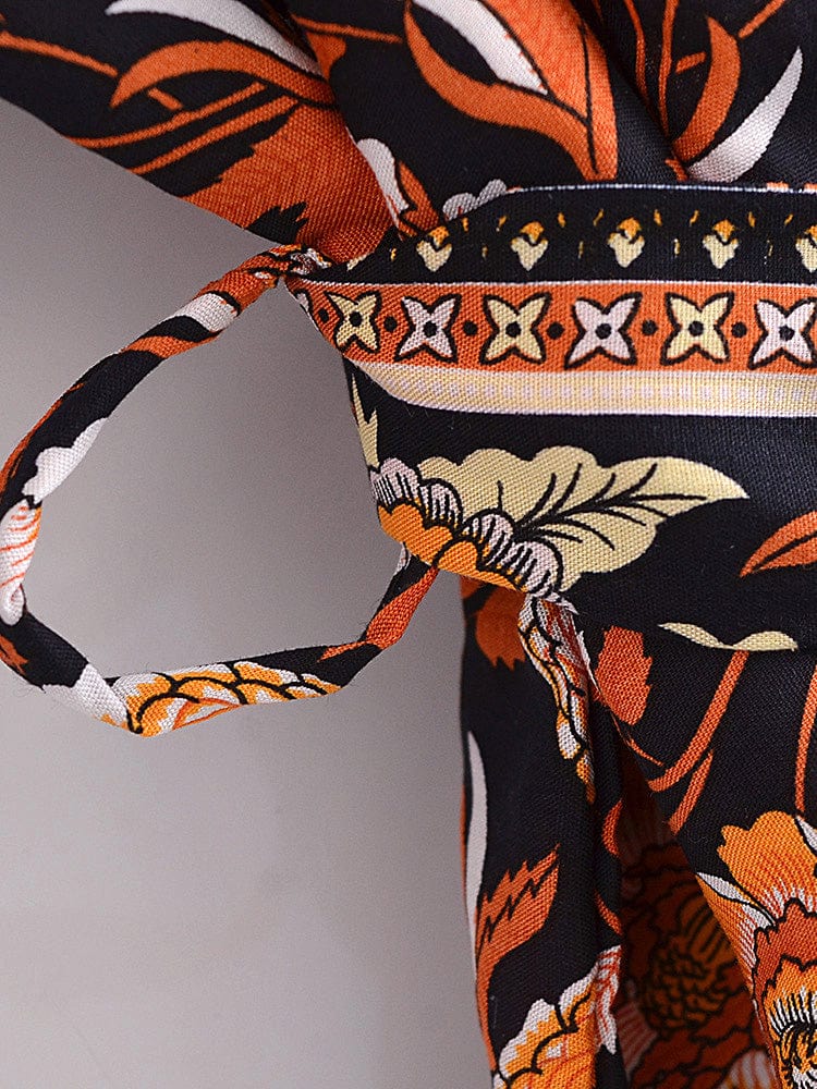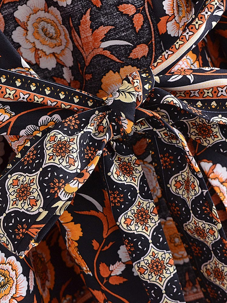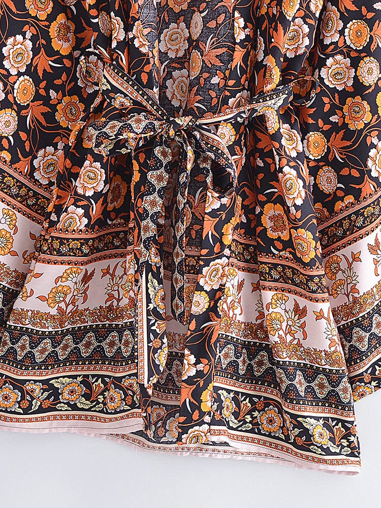 This billowy boudoir staple has exaggerated sleeves with cinch tie detail for additional shape and a bohemian-inspired floral print.
